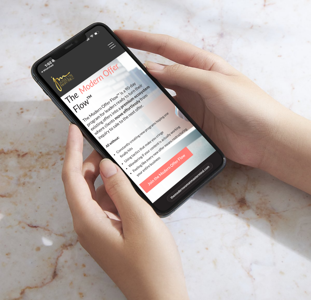 The Modern Offer Flow™ is a 90-day program for leaders ready to turn their existing offers into a premium ecosystem, where clients move from inquiry to sale to the next offer without relying on constant input.